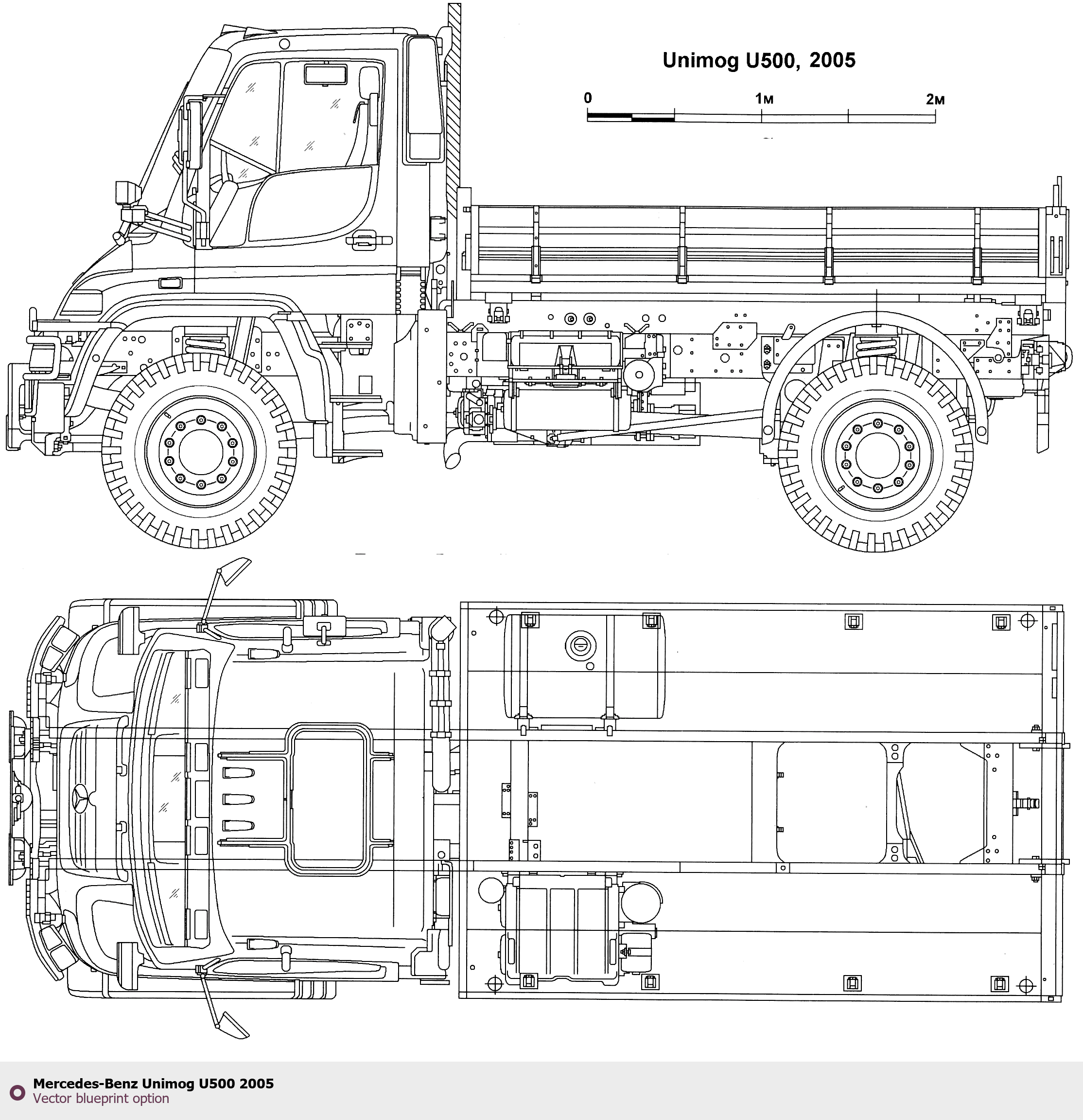 Raster blueprint of the 2005 Mercedes-Benz Unimog U500 Heavy Truck. This free downloadable image can be used for graphic projects, digital design, and 3D modeling. The file provides accurate exterior proportions of the vehicle. Model year: 2005. Body type: Heavy Truck.