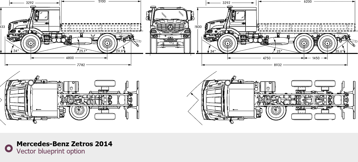 Raster blueprint of the 2014 Mercedes-Benz Zetros Heavy Truck. This free downloadable image can be used for graphic projects, digital design, and 3D modeling. The file provides accurate exterior proportions of the vehicle. Model year: 2014. Body type: Heavy Truck.