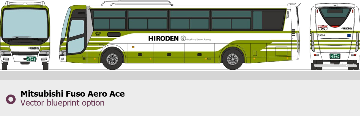 Raster blueprint of the Mitsubishi Fuso Aero Ace Bus. This free downloadable image can be used for graphic projects, digital design, and 3D modeling. The file provides accurate exterior proportions of the vehicle. Body type: Bus.
