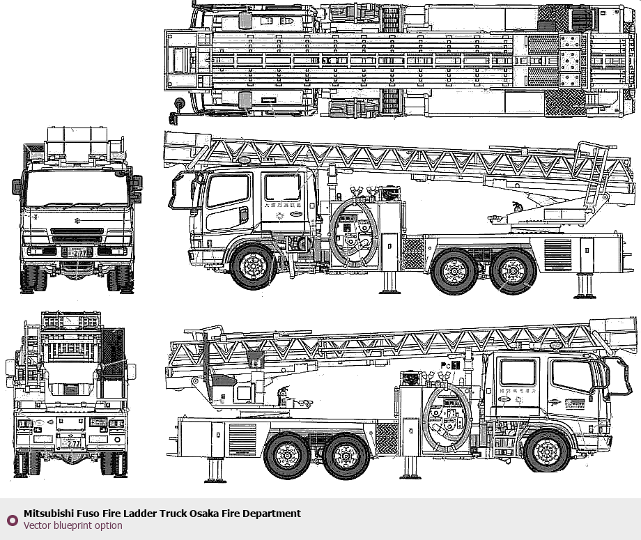 Raster blueprint of the Mitsubishi Fuso Fire Ladder Truck Osaka Fire Department Heavy Truck. This free downloadable image can be used for graphic projects, digital design, and 3D modeling. The file provides accurate exterior proportions of the vehicle. Body type: Heavy Truck.