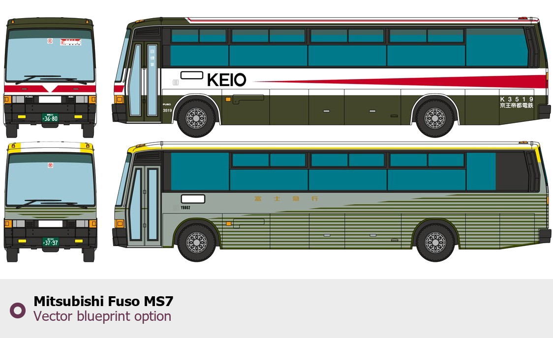 Raster blueprint of the Mitsubishi Fuso MS7 Bus. This free downloadable image can be used for graphic projects, digital design, and 3D modeling. The file provides accurate exterior proportions of the vehicle. Body type: Bus.