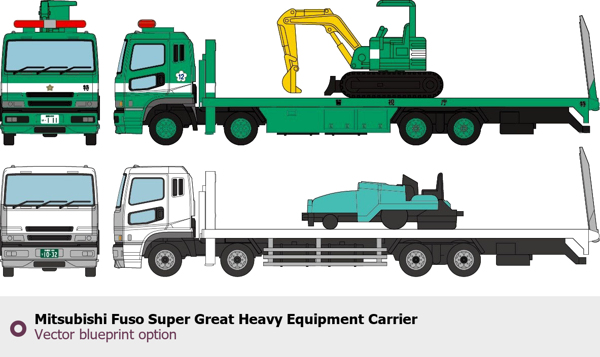 Raster blueprint of the Mitsubishi Fuso Super Great Heavy Equipment Carrier Heavy Truck. This free downloadable image can be used for graphic projects, digital design, and 3D modeling. The file provides accurate exterior proportions of the vehicle. Body type: Heavy Truck.