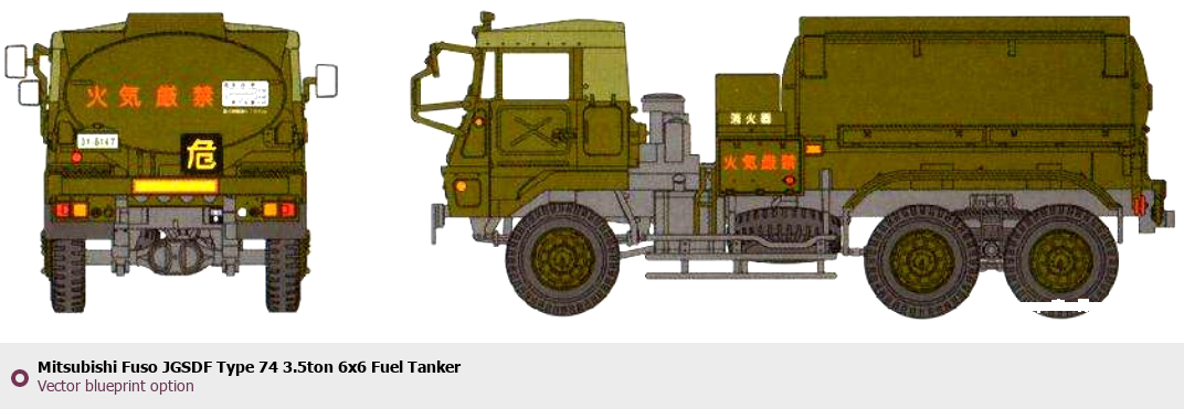 Raster blueprint of the Mitsubishi Fuso JGSDF Type 74 3.5ton 6x6 Fuel Tanker Heavy Truck. This free downloadable image can be used for graphic projects, digital design, and 3D modeling. The file provides accurate exterior proportions of the vehicle. Body type: Heavy Truck.