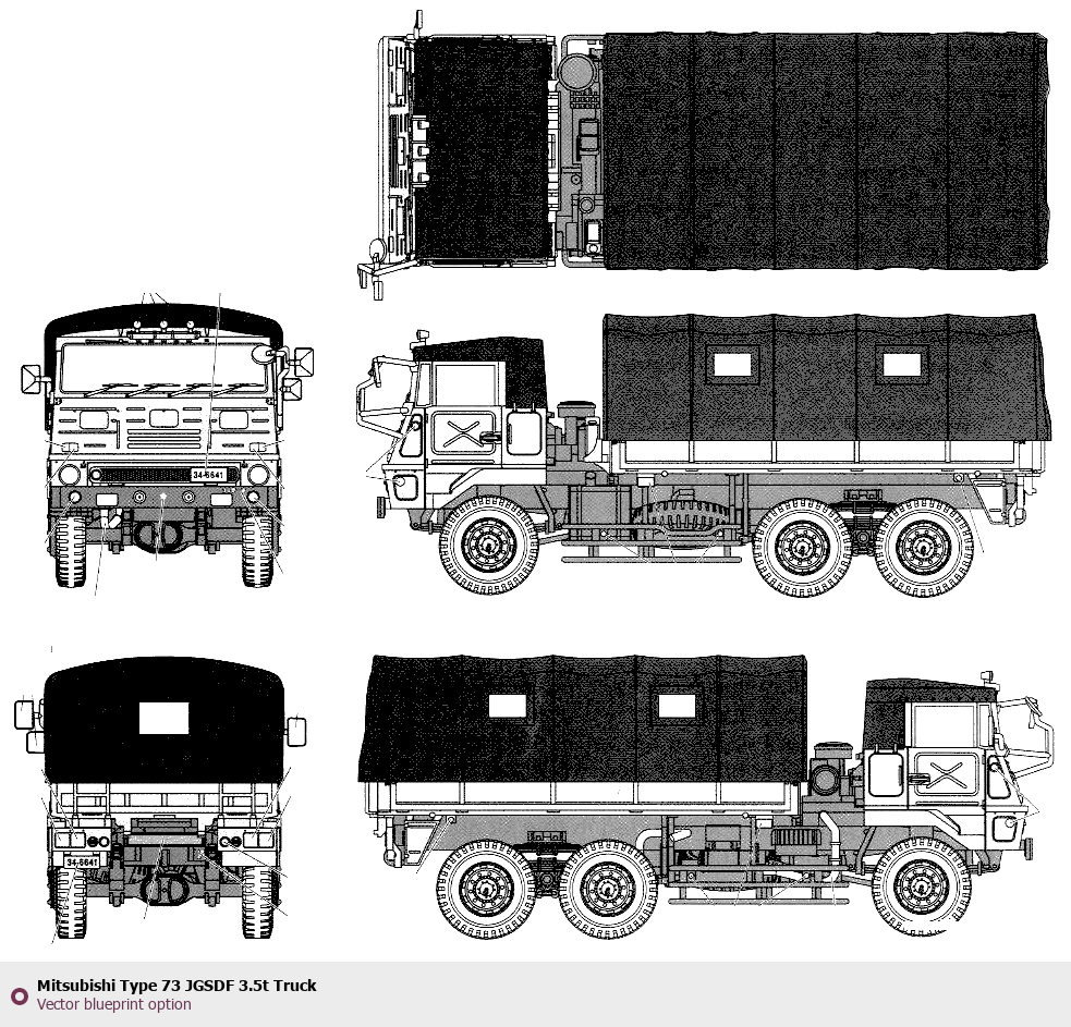 Raster blueprint of the Mitsubishi Type 73 JGSDF 3.5t Truck Heavy Truck. This free downloadable image can be used for graphic projects, digital design, and 3D modeling. The file provides accurate exterior proportions of the vehicle. Body type: Heavy Truck.
