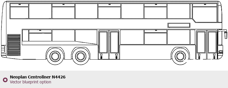 Raster blueprint of the Neoplan Centroliner N4426 Bus. This free downloadable image can be used for graphic projects, digital design, and 3D modeling. The file provides accurate exterior proportions of the vehicle. Body type: Bus.