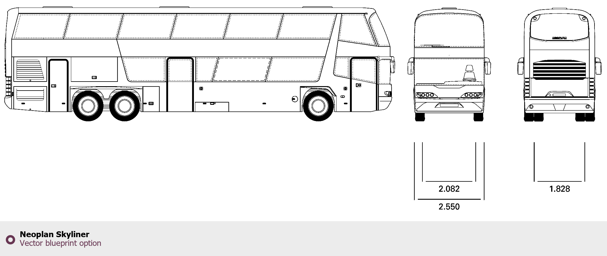 Raster blueprint of the Neoplan Skyliner Bus. This free downloadable image can be used for graphic projects, digital design, and 3D modeling. The file provides accurate exterior proportions of the vehicle. Body type: Bus.