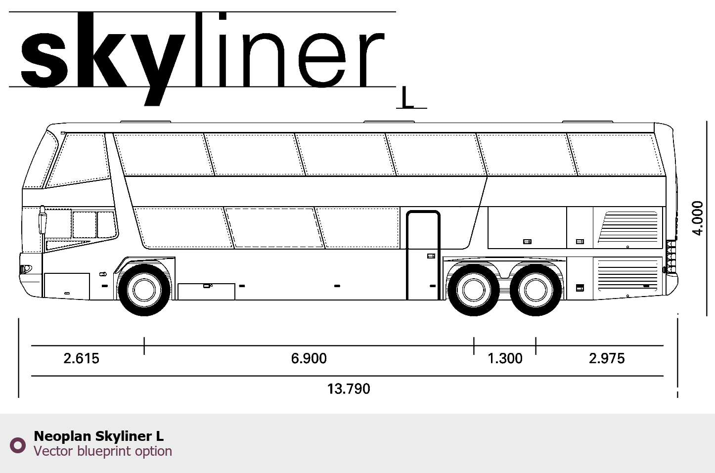 Raster blueprint of the Neoplan Skyliner L Bus. This free downloadable image can be used for graphic projects, digital design, and 3D modeling. The file provides accurate exterior proportions of the vehicle. Body type: Bus.