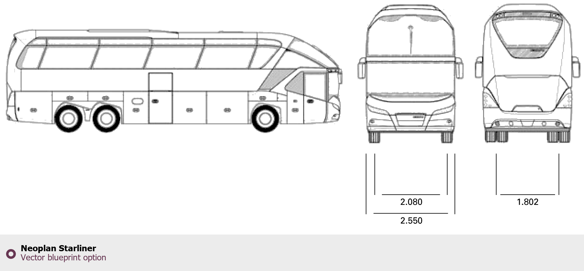 Raster blueprint of the Neoplan Starliner Bus. This free downloadable image can be used for graphic projects, digital design, and 3D modeling. The file provides accurate exterior proportions of the vehicle. Body type: Bus.