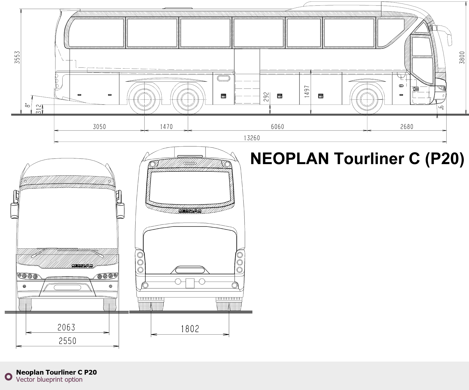 Raster blueprint of the Neoplan Tourliner C P20 Bus. This free downloadable image can be used for graphic projects, digital design, and 3D modeling. The file provides accurate exterior proportions of the vehicle. Body type: Bus.