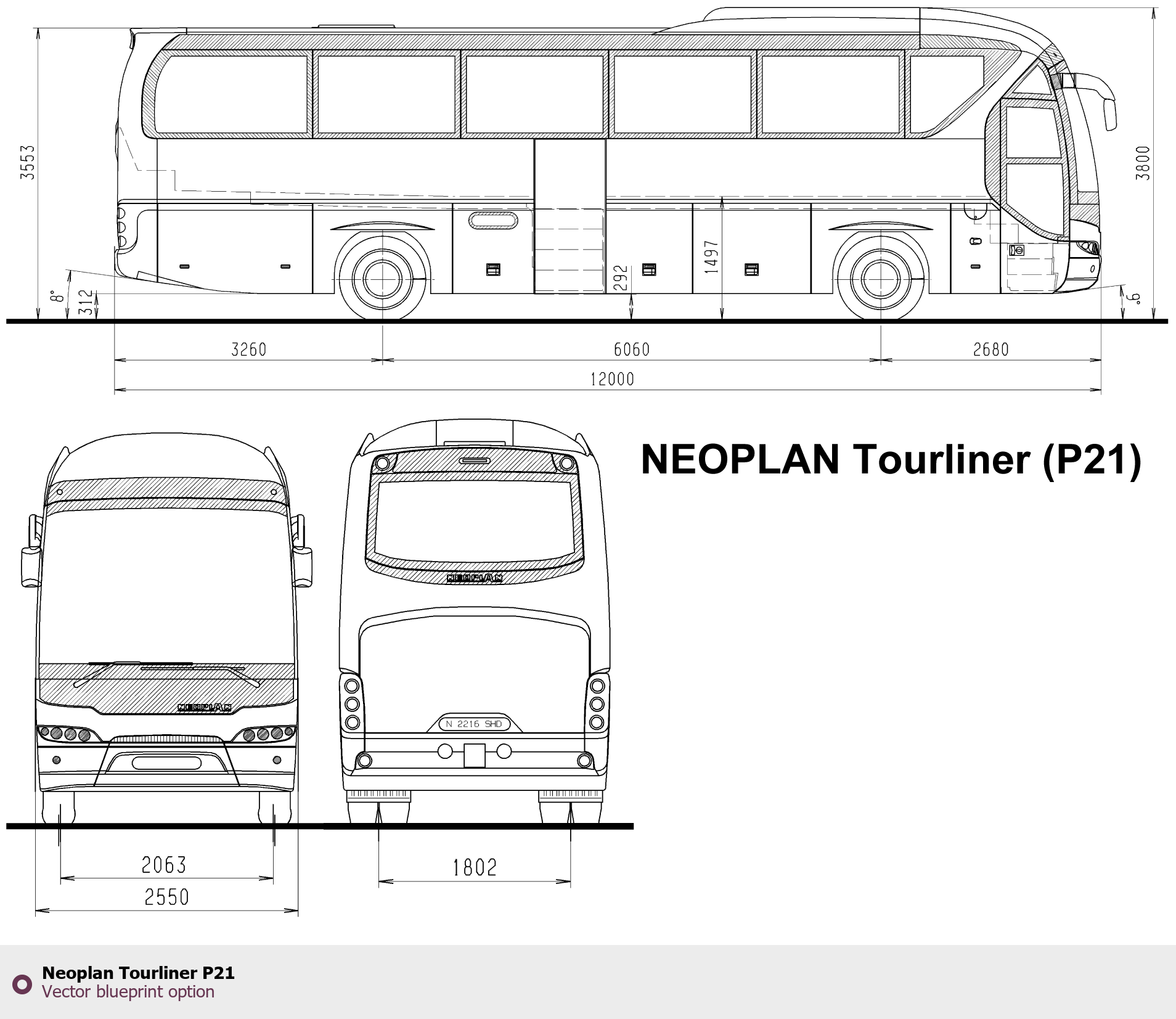 Raster blueprint of the Neoplan Tourliner P21 Bus. This free downloadable image can be used for graphic projects, digital design, and 3D modeling. The file provides accurate exterior proportions of the vehicle. Body type: Bus.