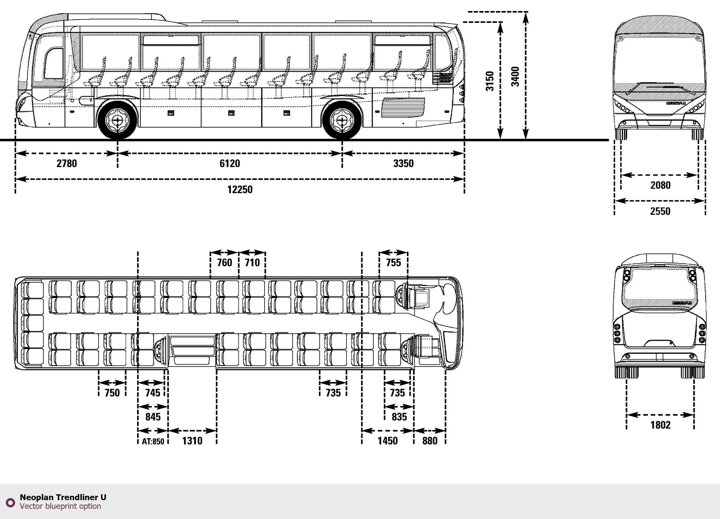 Raster blueprint of the Neoplan Trendliner U Bus. This free downloadable image can be used for graphic projects, digital design, and 3D modeling. The file provides accurate exterior proportions of the vehicle. Body type: Bus.