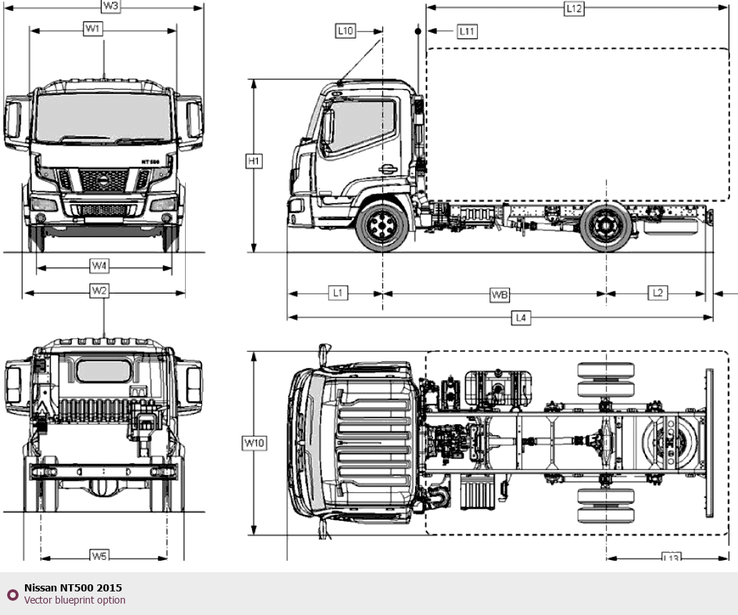 Raster blueprint of the 2015 Nissan NT500 Heavy Truck. This free downloadable image can be used for graphic projects, digital design, and 3D modeling. The file provides accurate exterior proportions of the vehicle. Model year: 2015. Body type: Heavy Truck.