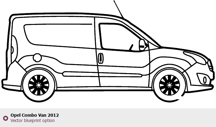 Raster blueprint of the 2012 Opel Combo Van Van. This free downloadable image can be used for graphic projects, digital design, and 3D modeling. The file provides accurate exterior proportions of the vehicle. Model year: 2012. Body type: Van.