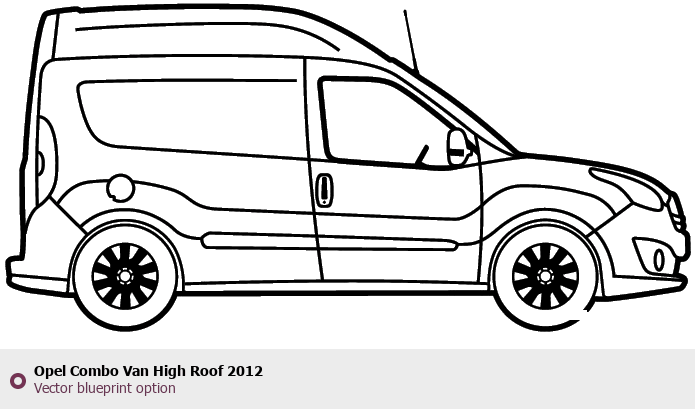 Raster blueprint of the 2012 Opel Combo Van High Roof Van. This free downloadable image can be used for graphic projects, digital design, and 3D modeling. The file provides accurate exterior proportions of the vehicle. Model year: 2012. Body type: Van.