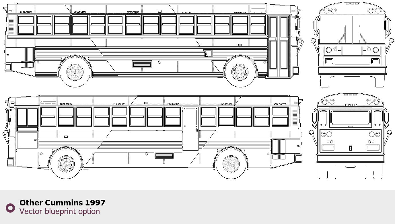 Raster blueprint of the 1997 Other Cummins Bus. This free downloadable image can be used for graphic projects, digital design, and 3D modeling. The file provides accurate exterior proportions of the vehicle. Model year: 1997. Body type: Bus.