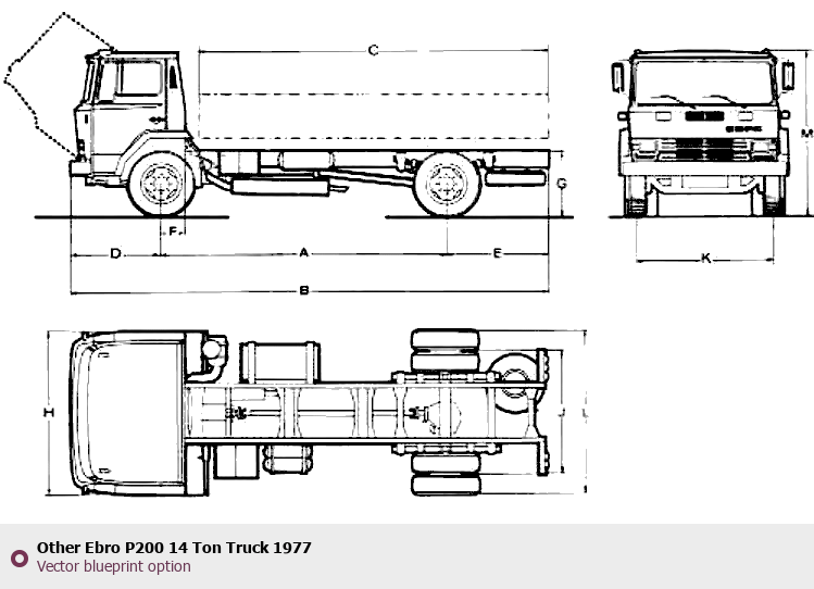 Raster blueprint of the 1977 Other Ebro P200 14 Ton Truck Heavy Truck. This free downloadable image can be used for graphic projects, digital design, and 3D modeling. The file provides accurate exterior proportions of the vehicle. Model year: 1977. Body type: Heavy Truck.