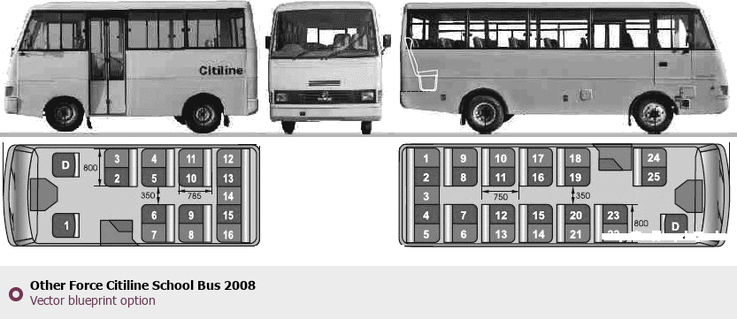 Raster blueprint of the 2008 Other Force Citiline School Bus Bus. This free downloadable image can be used for graphic projects, digital design, and 3D modeling. The file provides accurate exterior proportions of the vehicle. Model year: 2008. Body type: Bus.
