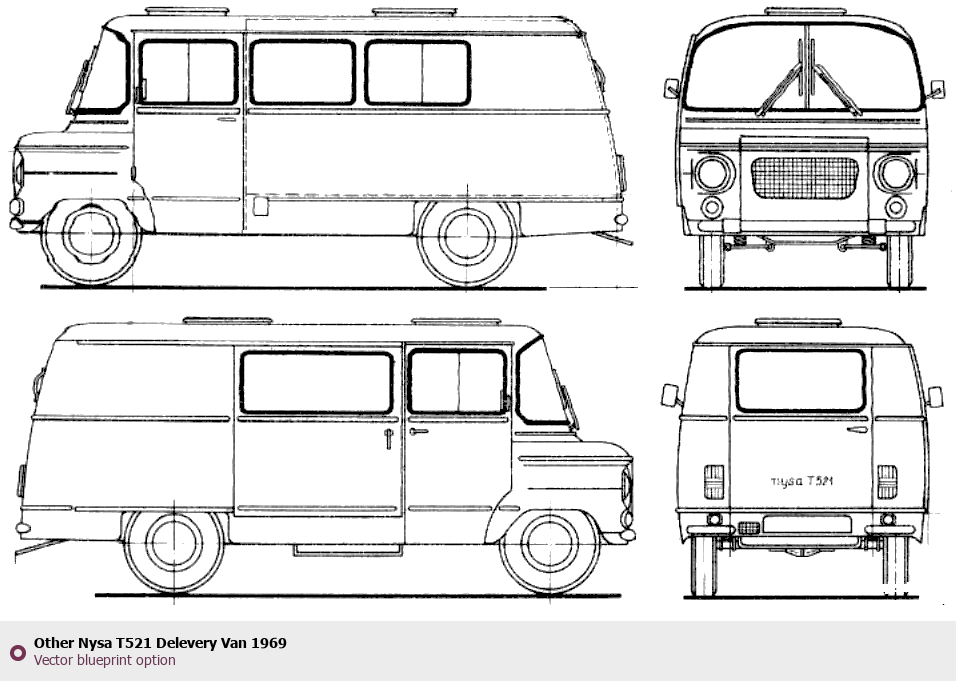 Raster blueprint of the 1969 Other Nysa T521 Delevery Van Van. This free downloadable image can be used for graphic projects, digital design, and 3D modeling. The file provides accurate exterior proportions of the vehicle. Model year: 1969. Body type: Van.