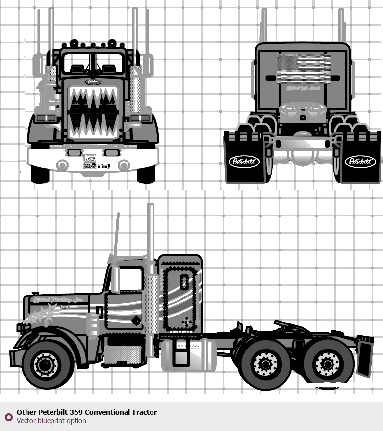 Raster blueprint of the Other Peterbilt 359 Conventional Tractor Heavy Truck. This free downloadable image can be used for graphic projects, digital design, and 3D modeling. The file provides accurate exterior proportions of the vehicle. Body type: Heavy Truck.