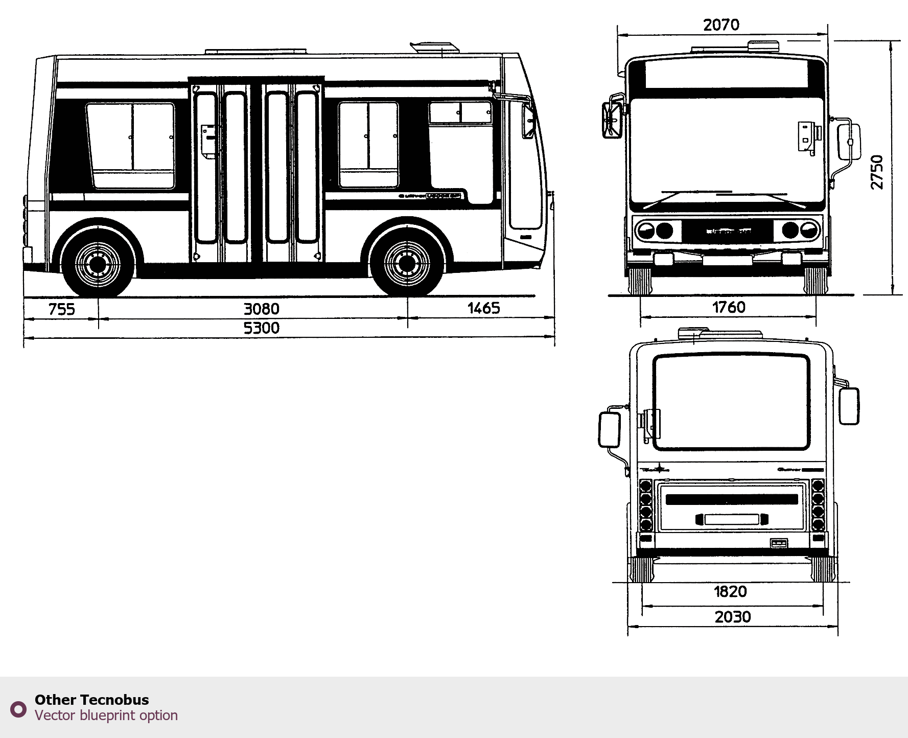 Raster blueprint of the Other Tecnobus Bus. This free downloadable image can be used for graphic projects, digital design, and 3D modeling. The file provides accurate exterior proportions of the vehicle. Body type: Bus.