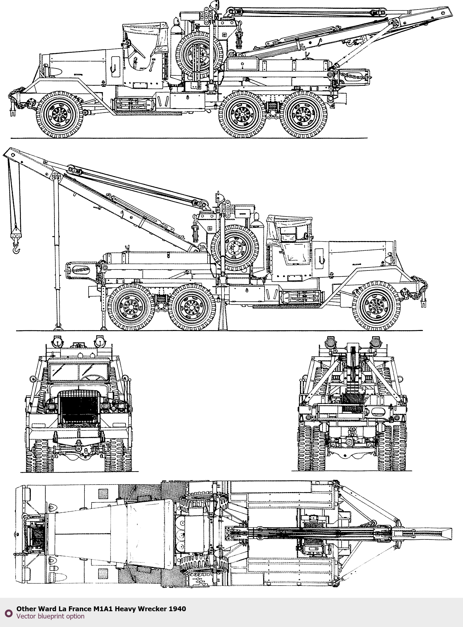 Raster blueprint of the Other Ward La France M1A1 Heavy Wrecker 1940 Heavy Truck. This free downloadable image can be used for graphic projects, digital design, and 3D modeling. The file provides accurate exterior proportions of the vehicle. Body type: Heavy Truck.