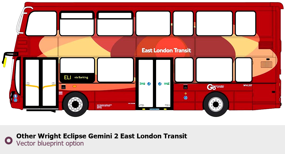 Raster blueprint of the Other Wright Eclipse Gemini 2 East London Transit Bus. This free downloadable image can be used for graphic projects, digital design, and 3D modeling. The file provides accurate exterior proportions of the vehicle. Body type: Bus.