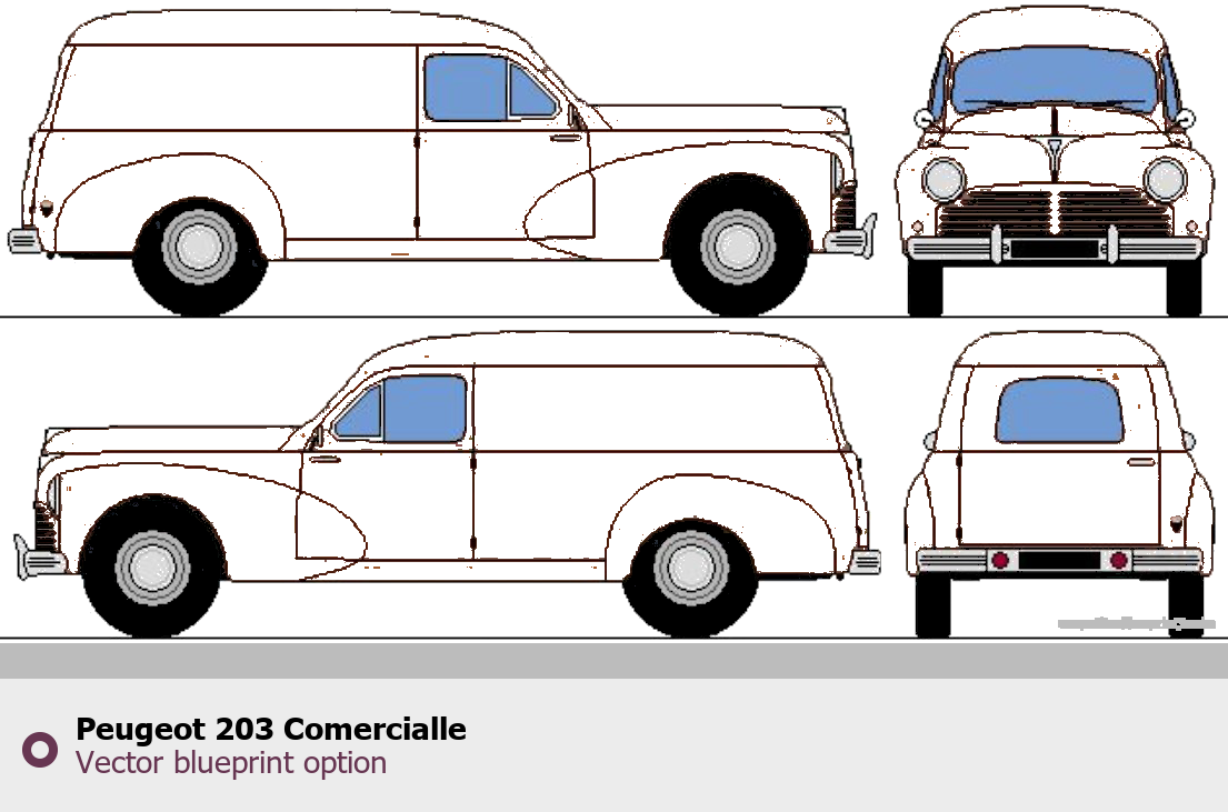 Raster blueprint of the Peugeot 203 Comercialle Pickup Truck. This free downloadable image can be used for graphic projects, digital design, and 3D modeling. The file provides accurate exterior proportions of the vehicle. Body type: Pickup Truck.