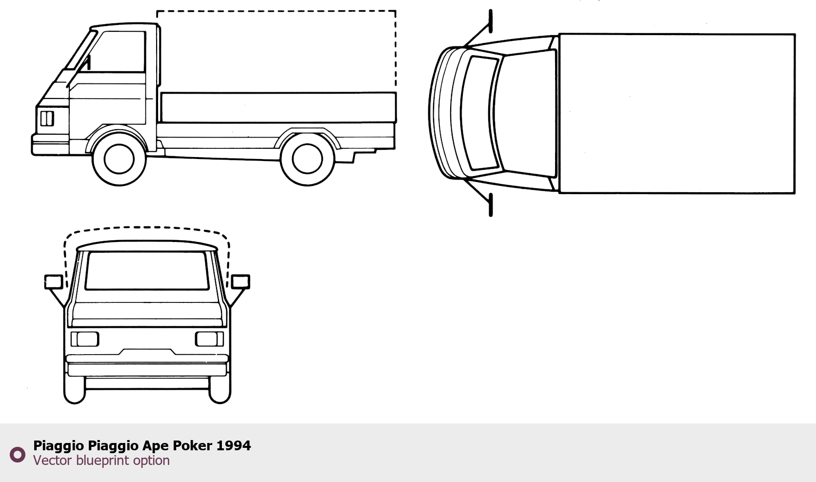 Raster blueprint of the 1994 Piaggio Ape Poker Tag. This free downloadable image can be used for graphic projects, digital design, and 3D modeling. The file provides accurate exterior proportions of the vehicle. Model year: 1994. Body type: Tag.