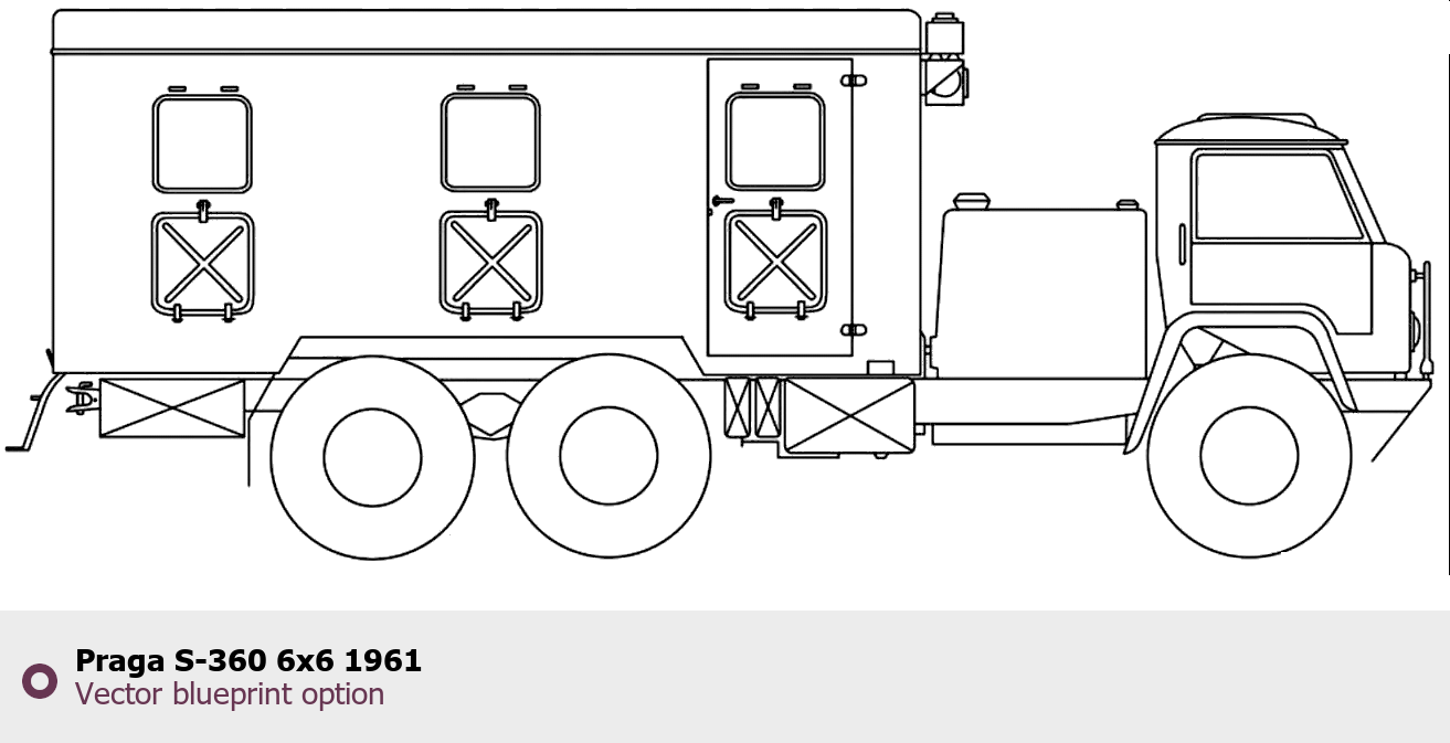 Raster blueprint of the 1961 Praga S-360 6x6 Heavy Truck. This free downloadable image can be used for graphic projects, digital design, and 3D modeling. The file provides accurate exterior proportions of the vehicle. Model year: 1961. Body type: Heavy Truck.