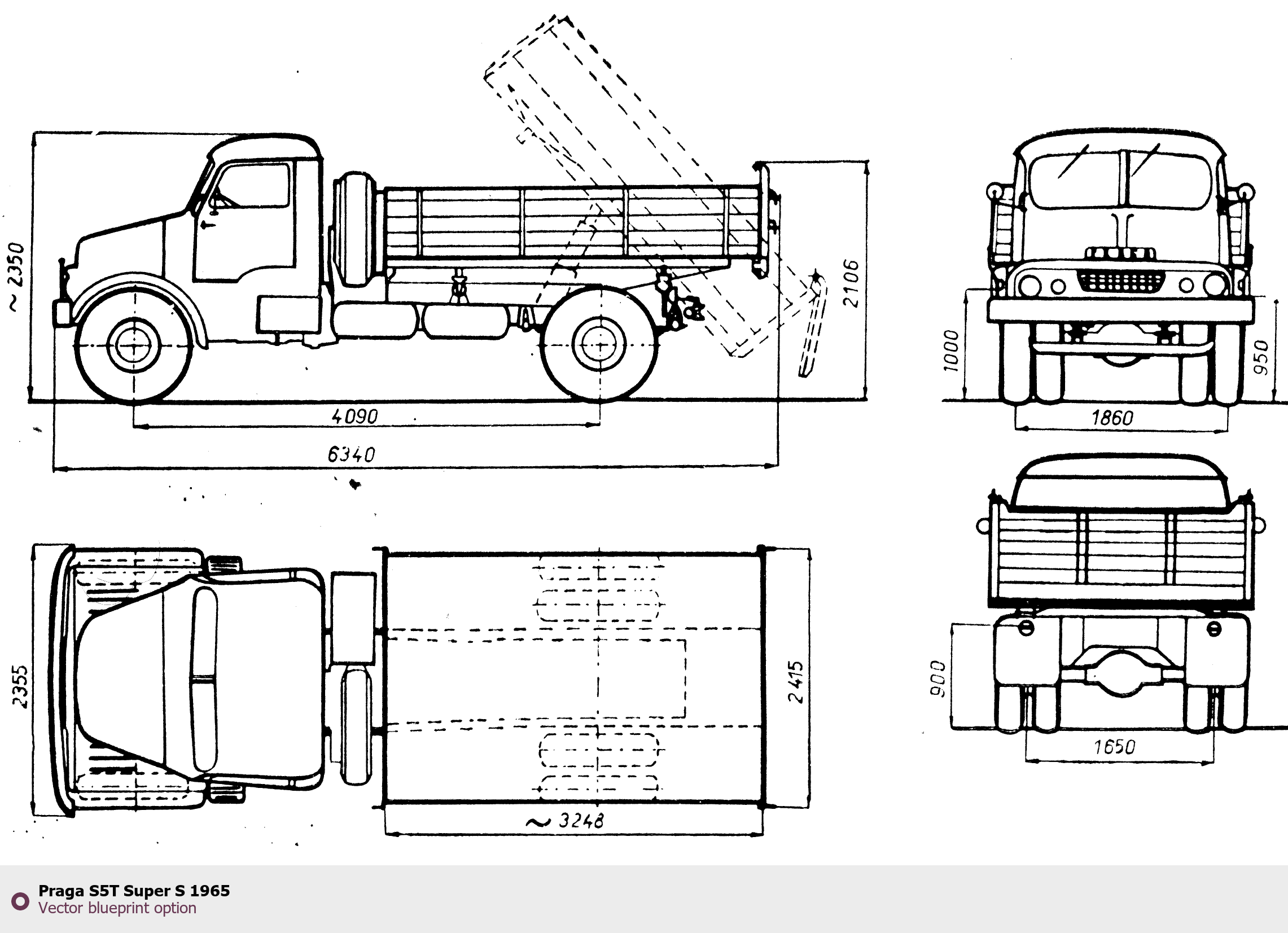Raster blueprint of the 1965 Praga S5T Super S Heavy Truck. This free downloadable image can be used for graphic projects, digital design, and 3D modeling. The file provides accurate exterior proportions of the vehicle. Model year: 1965. Body type: Heavy Truck.