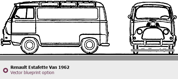 Raster blueprint of the 1962 Renault Estafette Van Van. This free downloadable image can be used for graphic projects, digital design, and 3D modeling. The file provides accurate exterior proportions of the vehicle. Model year: 1962. Body type: Van.