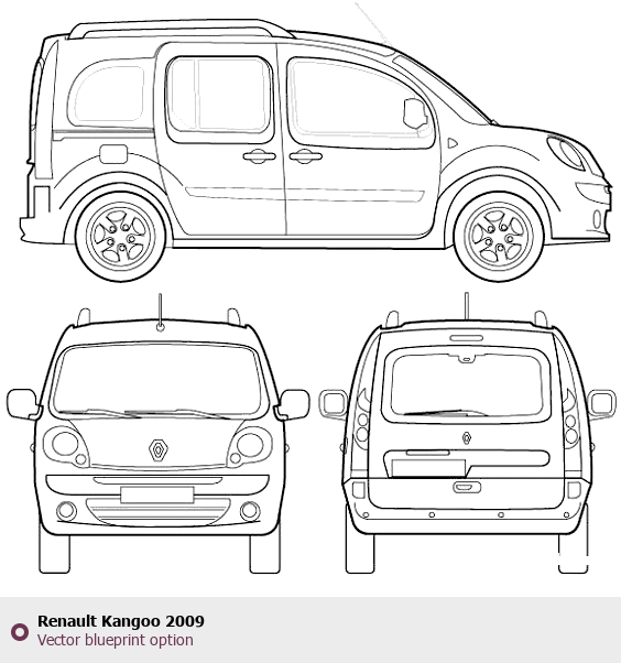 Raster blueprint of the 2009 Renault Kangoo Tag. This free downloadable image can be used for graphic projects, digital design, and 3D modeling. The file provides accurate exterior proportions of the vehicle. Model year: 2009. Body type: Tag.