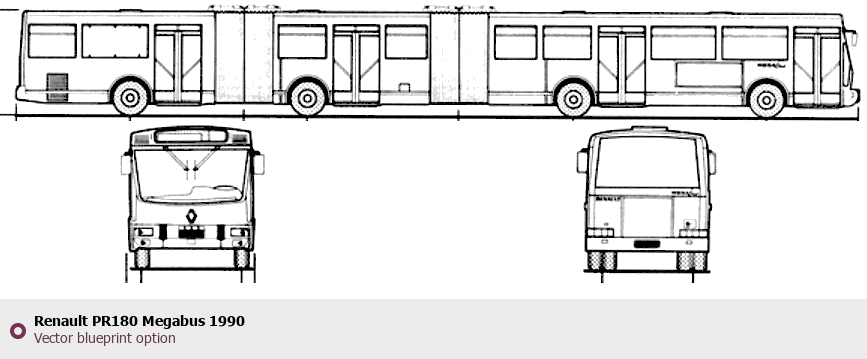 Raster blueprint of the 1990 Renault PR180 Megabus Bus. This free downloadable image can be used for graphic projects, digital design, and 3D modeling. The file provides accurate exterior proportions of the vehicle. Model year: 1990. Body type: Bus.
