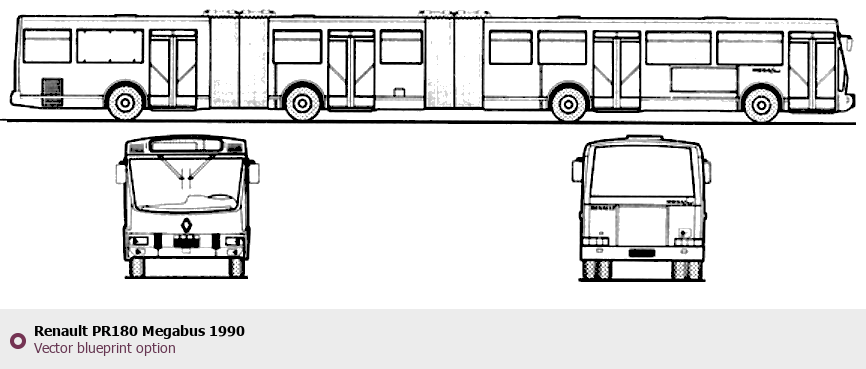 Raster blueprint of the 1990 Renault PR180 Megabus Bus. This free downloadable image can be used for graphic projects, digital design, and 3D modeling. The file provides accurate exterior proportions of the vehicle. Model year: 1990. Body type: Bus.