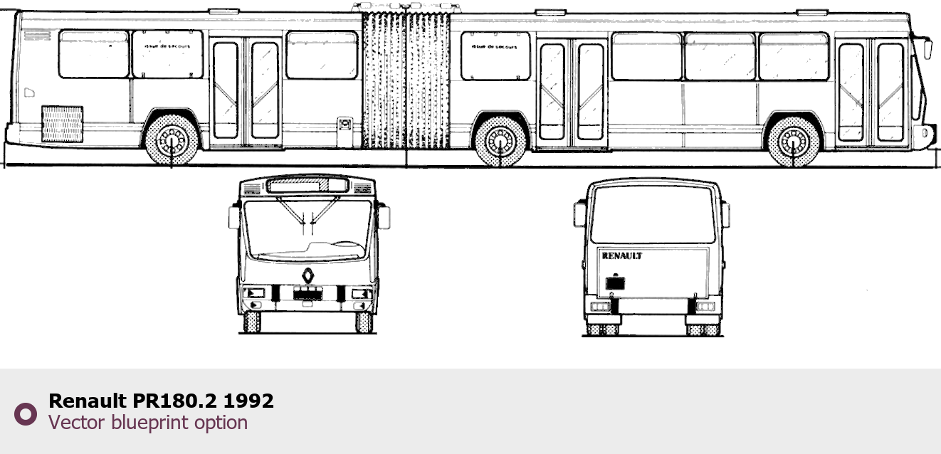 Raster blueprint of the 1992 Renault PR180.2 Bus. This free downloadable image can be used for graphic projects, digital design, and 3D modeling. The file provides accurate exterior proportions of the vehicle. Model year: 1992. Body type: Bus.
