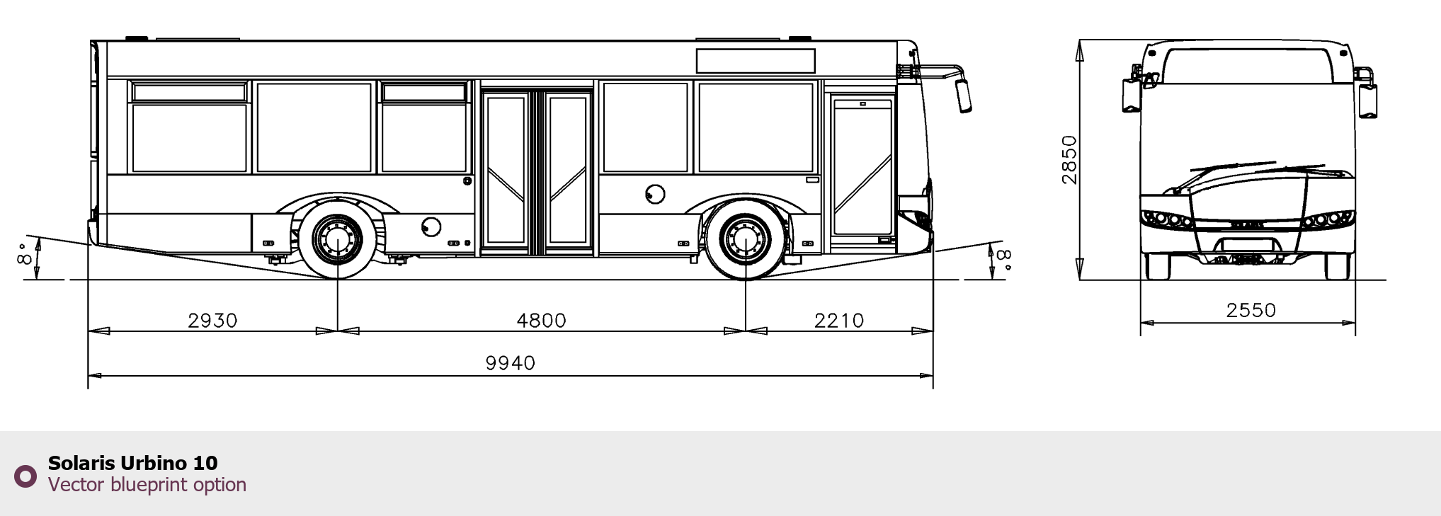 Raster blueprint of the Solaris Urbino 10 Bus. This free downloadable image can be used for graphic projects, digital design, and 3D modeling. The file provides accurate exterior proportions of the vehicle. Body type: Bus.