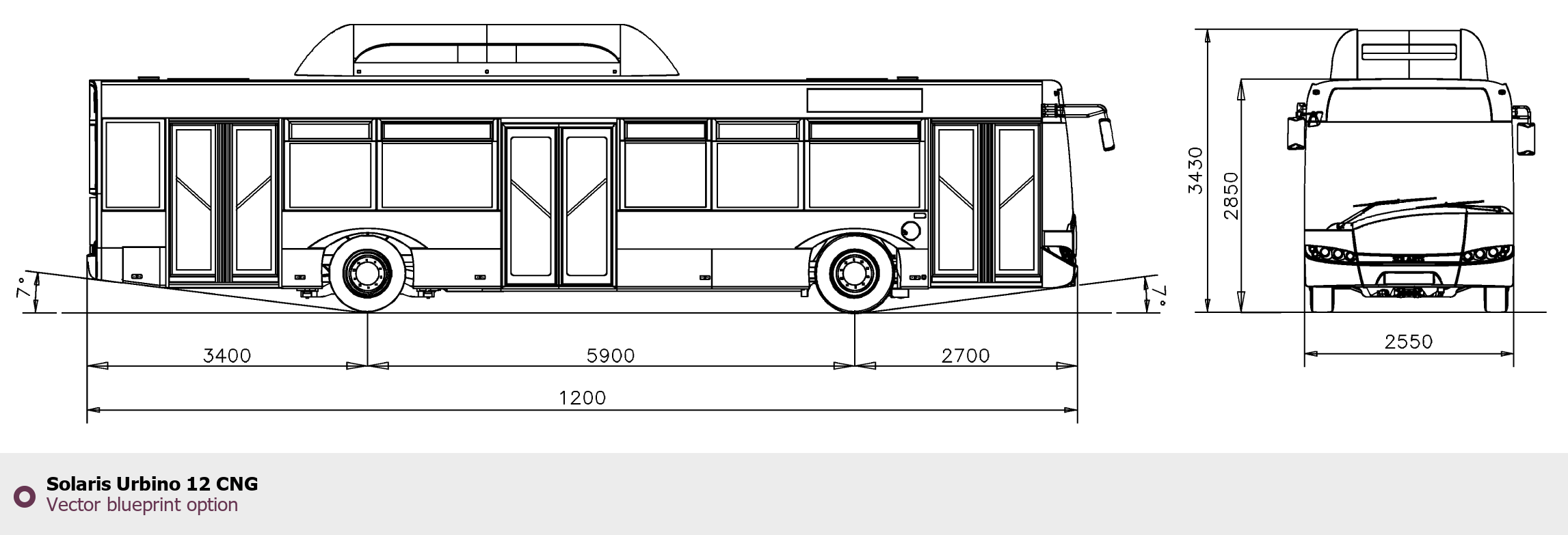 Raster blueprint of the Solaris Urbino 12 CNG Bus. This free downloadable image can be used for graphic projects, digital design, and 3D modeling. The file provides accurate exterior proportions of the vehicle. Body type: Bus.