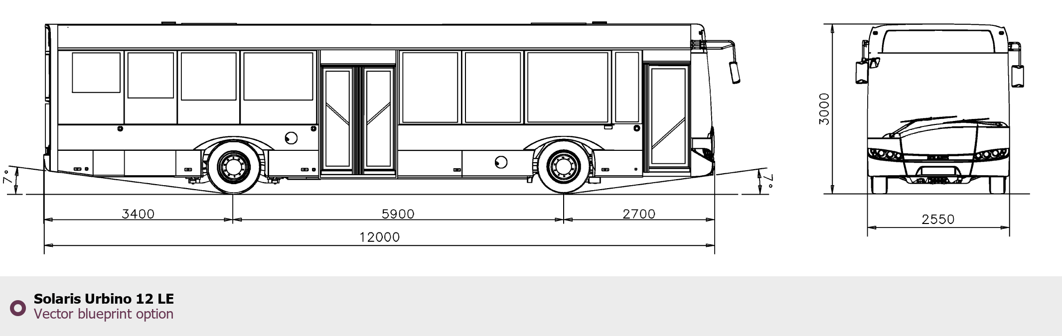 Raster blueprint of the Solaris Urbino 12 LE Bus. This free downloadable image can be used for graphic projects, digital design, and 3D modeling. The file provides accurate exterior proportions of the vehicle. Body type: Bus.
