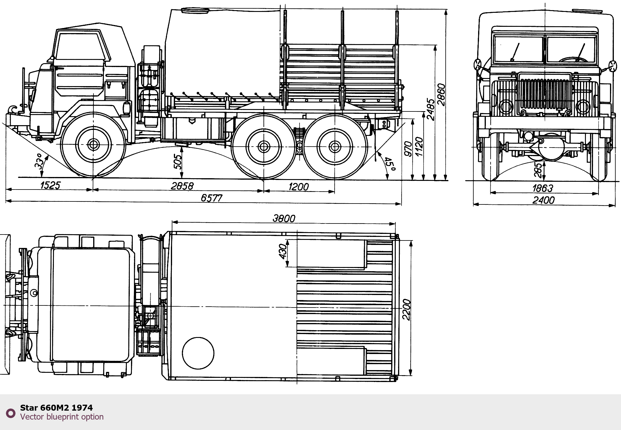 Raster blueprint of the 1974 Star 660M2 Heavy Truck. This free downloadable image can be used for graphic projects, digital design, and 3D modeling. The file provides accurate exterior proportions of the vehicle. Model year: 1974. Body type: Heavy Truck.