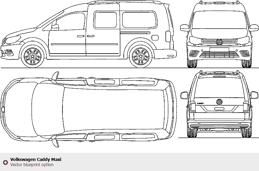 Raster blueprint of the Volkswagen Caddy Maxi Tag. This free downloadable image can be used for graphic projects, digital design, and 3D modeling. The file provides accurate exterior proportions of the vehicle. Body type: Tag.