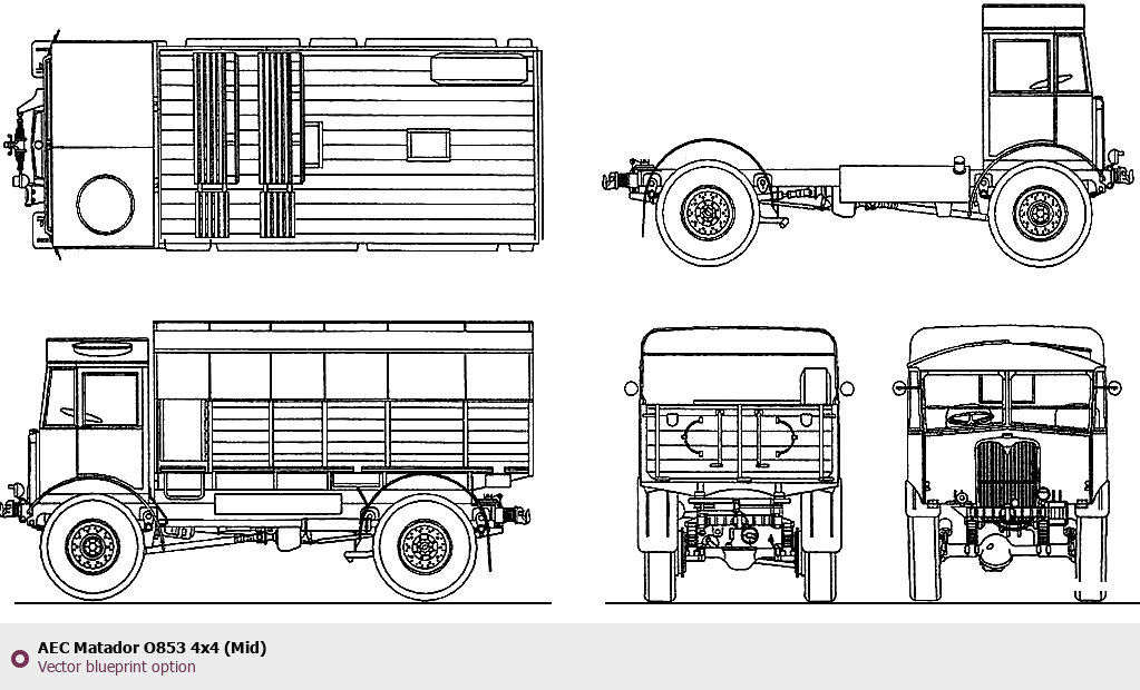 Raster blueprint of the AEC Matador O853 4x4 (Mid) Heavy Truck. This free downloadable image can be used for graphic projects, digital design, and 3D modeling. The file provides accurate exterior proportions of the vehicle. Body type: Heavy Truck.