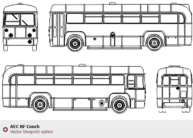 Raster blueprint of the AEC RF Couch Bus. This free downloadable image can be used for graphic projects, digital design, and 3D modeling. The file provides accurate exterior proportions of the vehicle. Body type: Bus.