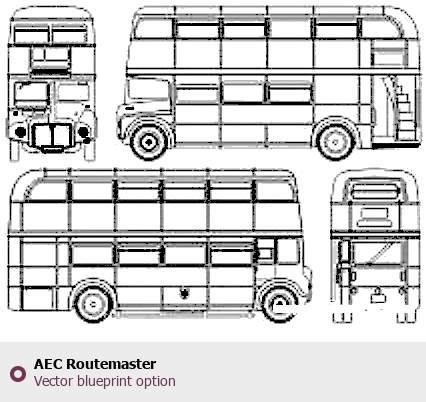 Raster blueprint of the AEC Routemaster Bus. This free downloadable image can be used for graphic projects, digital design, and 3D modeling. The file provides accurate exterior proportions of the vehicle. Body type: Bus.