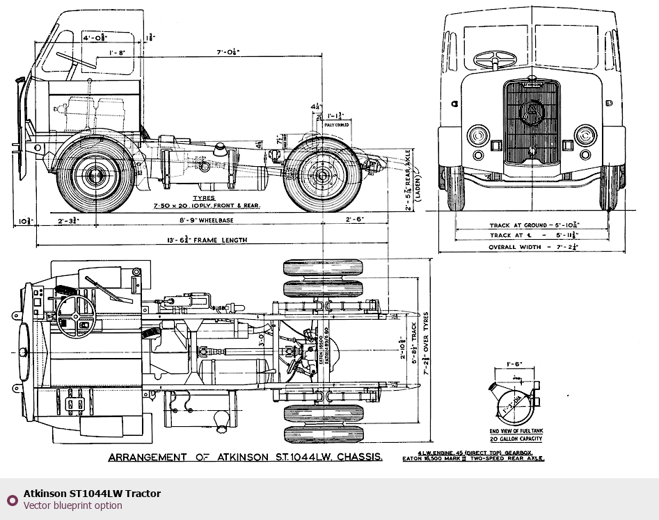 Raster blueprint of the Atkinson ST1044LW Tractor Heavy Truck. This free downloadable image can be used for graphic projects, digital design, and 3D modeling. The file provides accurate exterior proportions of the vehicle. Body type: Heavy Truck.