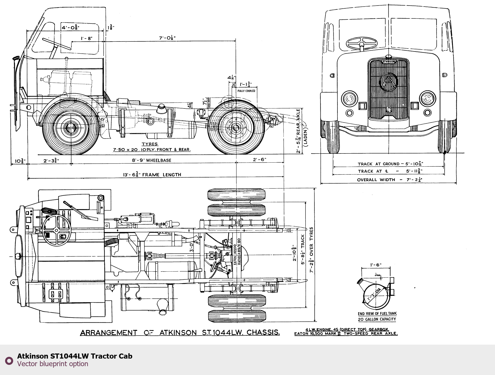 Raster blueprint of the Atkinson ST1044LW Tractor Cab Heavy Truck. This free downloadable image can be used for graphic projects, digital design, and 3D modeling. The file provides accurate exterior proportions of the vehicle. Body type: Heavy Truck.
