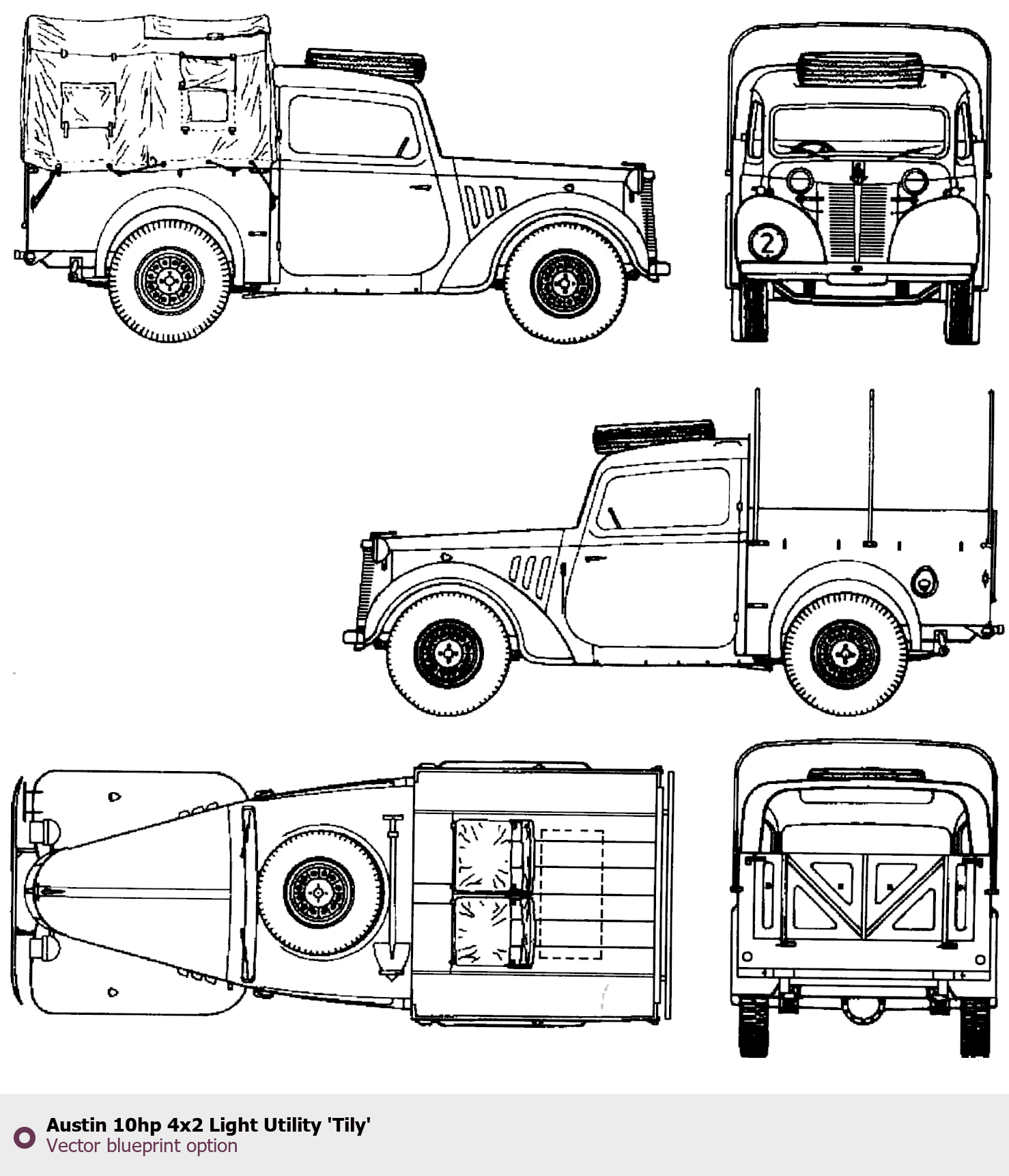 Raster blueprint of the Austin 10hp 4x2 Light Utility 'Tily' Pickup Truck. This free downloadable image can be used for graphic projects, digital design, and 3D modeling. The file provides accurate exterior proportions of the vehicle. Body type: Pickup Truck.