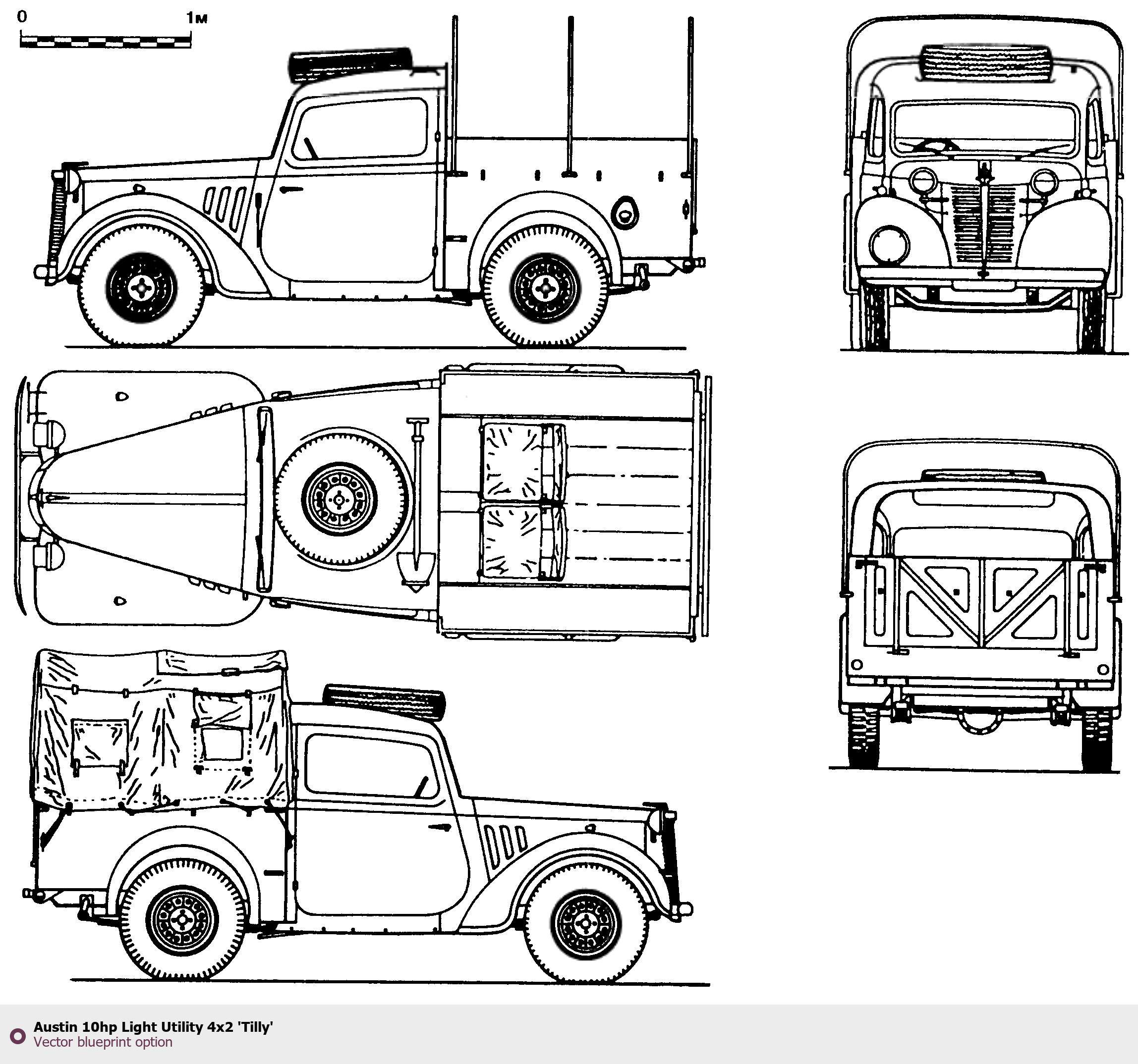 Raster blueprint of the Austin 10hp Light Utility 4x2 'Tilly' Pickup Truck. This free downloadable image can be used for graphic projects, digital design, and 3D modeling. The file provides accurate exterior proportions of the vehicle. Body type: Pickup Truck.