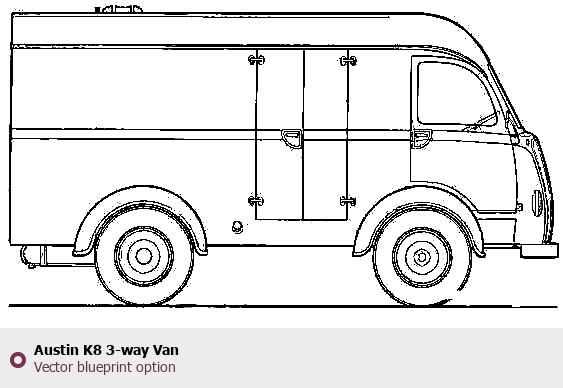 Raster blueprint of the Austin K8 3-way Van Van. This free downloadable image can be used for graphic projects, digital design, and 3D modeling. The file provides accurate exterior proportions of the vehicle. Body type: Van.