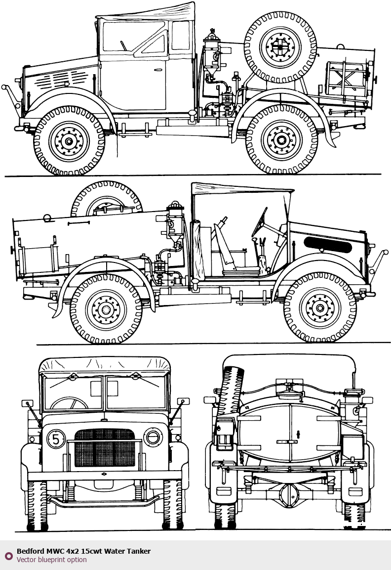 Raster blueprint of the Bedford MWC 4x2 15cwt Water Tanker Heavy Truck. This free downloadable image can be used for graphic projects, digital design, and 3D modeling. The file provides accurate exterior proportions of the vehicle. Body type: Heavy Truck.