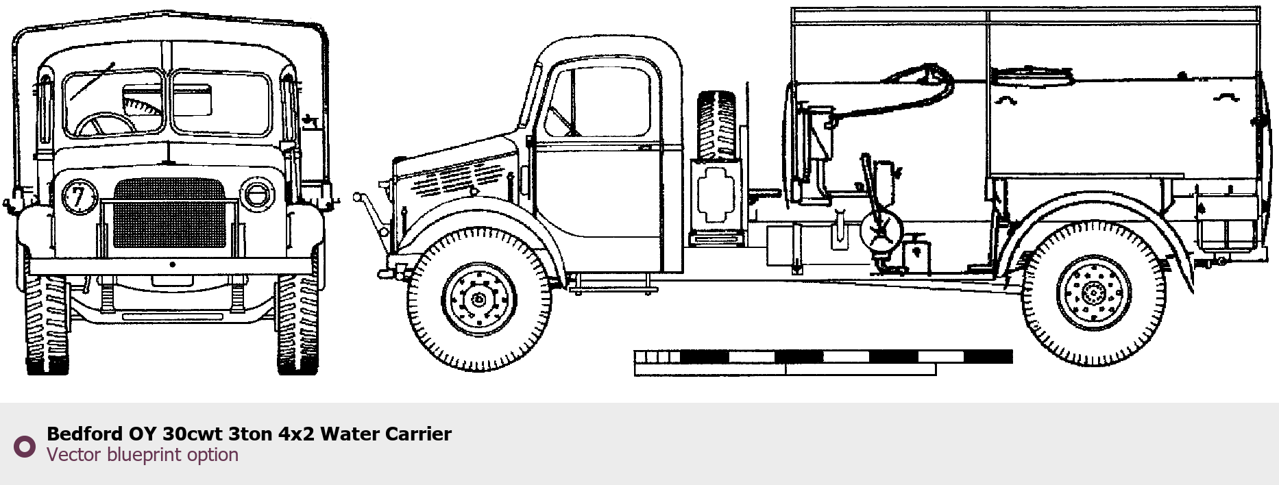 Raster blueprint of the Bedford OY 30cwt 3ton 4x2 Water Carrier Heavy Truck. This free downloadable image can be used for graphic projects, digital design, and 3D modeling. The file provides accurate exterior proportions of the vehicle. Body type: Heavy Truck.